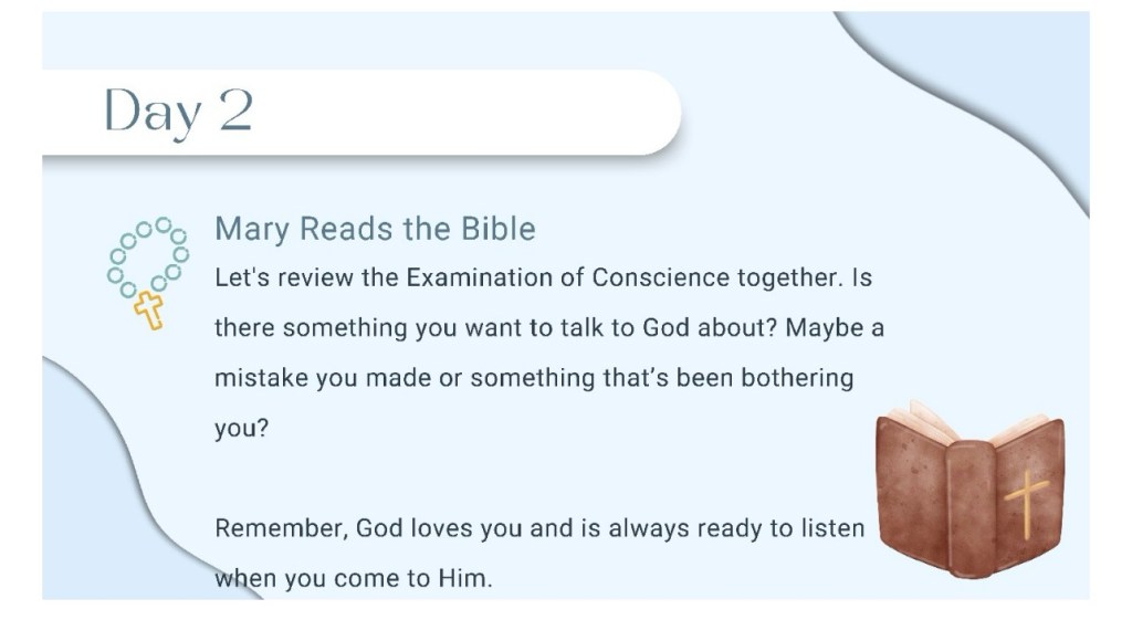 To anchor our day, students begin with a short slide presentation I created. These slides introduce Mary’s task or reflection point for the day. Some days she’s tidying up her space. Other days she’s making Christmas cards, feeling baby Jesus kick, hearing about the census, or planning her trip to Bethlehem. Each slide contains a simple message: Mary is preparing, and so are we.